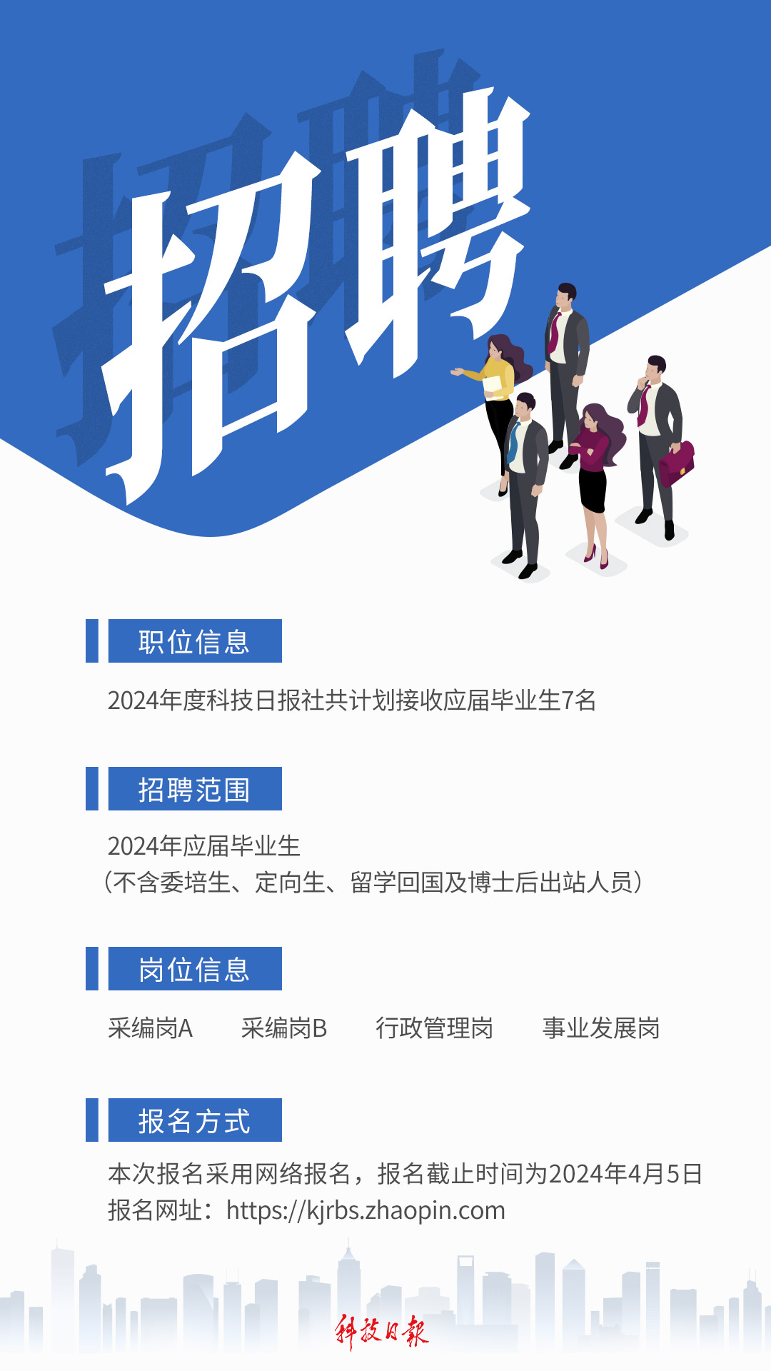 科技日报社是中央编委批准设立、由科学技术部代管的副部级事业单位,是承担党和国家科技宣传任务的中央主流媒体。按照《事业单位人事管理条例》《事业单位公开招聘人员暂行规定》,根据报社发展需要,组织开展2024年应届毕业生公开招聘工作,现将有关事项公告如下: