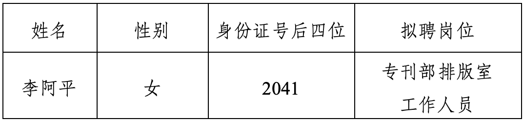 根据公开招聘相关规定,科技日报社组织开展了专刊部排版室工作人员公开招聘工作。经资格审查、笔试、面试、考察、体检等程序,研究确定了拟聘人员名单,现进行公示。