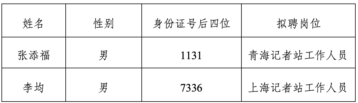 根据公开招聘相关规定,科技日报社组织开展了部分地方记者站公开招聘工作。经资格审查、笔试、面试、考察、体检等程序,研究确定了青海、上海记者站拟聘人员名单,现进行公示。