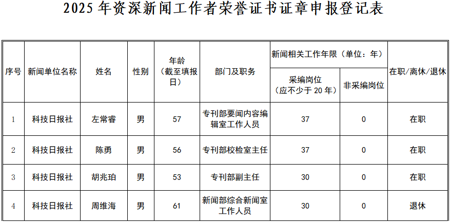 根据中华全国新闻工作者协会《关于2025年资深新闻工作者荣誉证书证章申报工作的通知》等要求,为表彰长期工作在新闻采编业务岗位的资深新闻工作者,现将科技日报社在职及退休人员中申报资深新闻工作者荣誉证书证章人员名单进行公示。