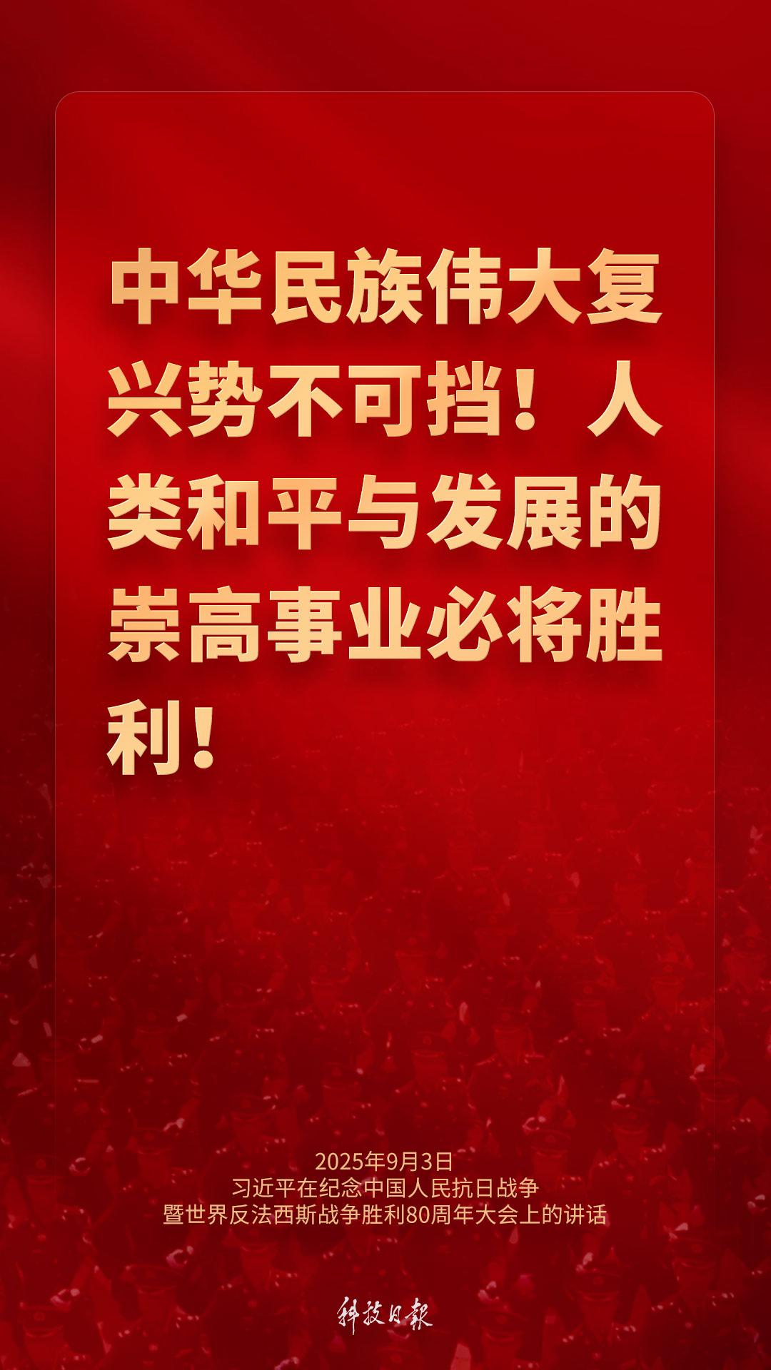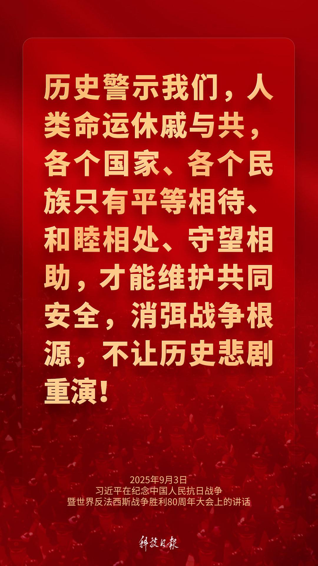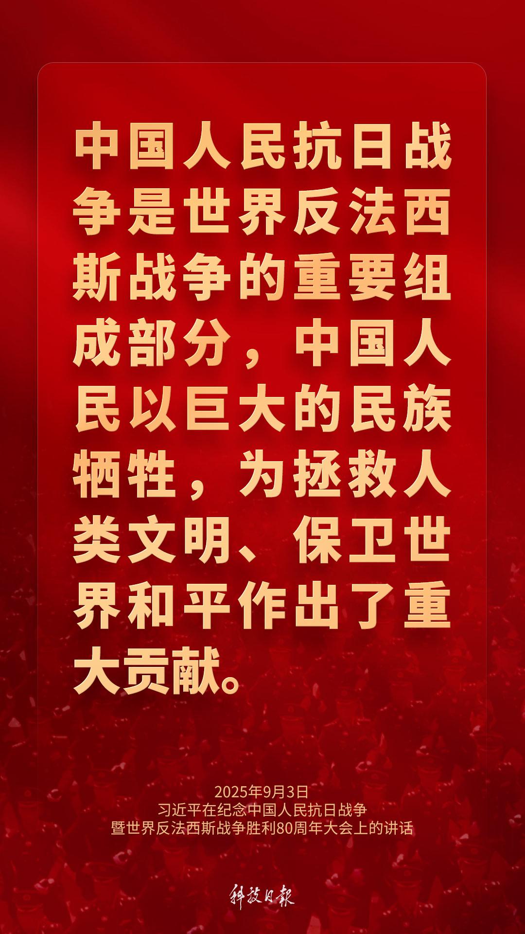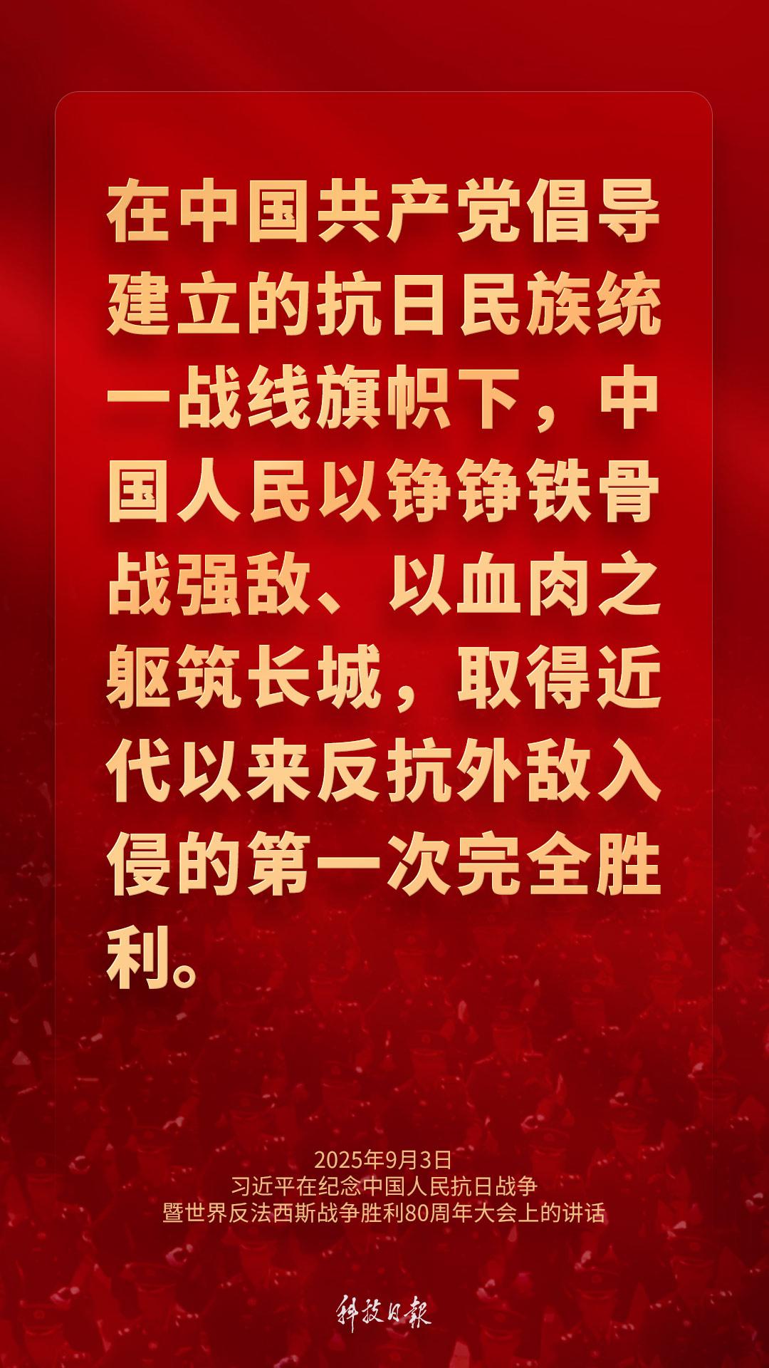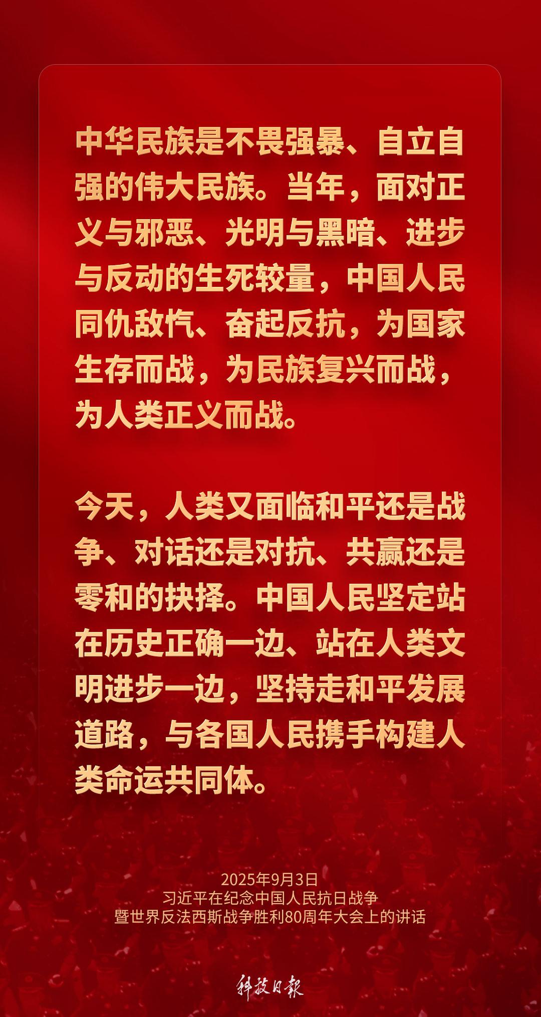 9月3日上午,纪念中国人民抗日战争暨世界反法西斯战争胜利80周年大会在北京天安门广场隆重举行。中共中央总书记、国家主席、中央军委主席习近平发表重要讲话强调——