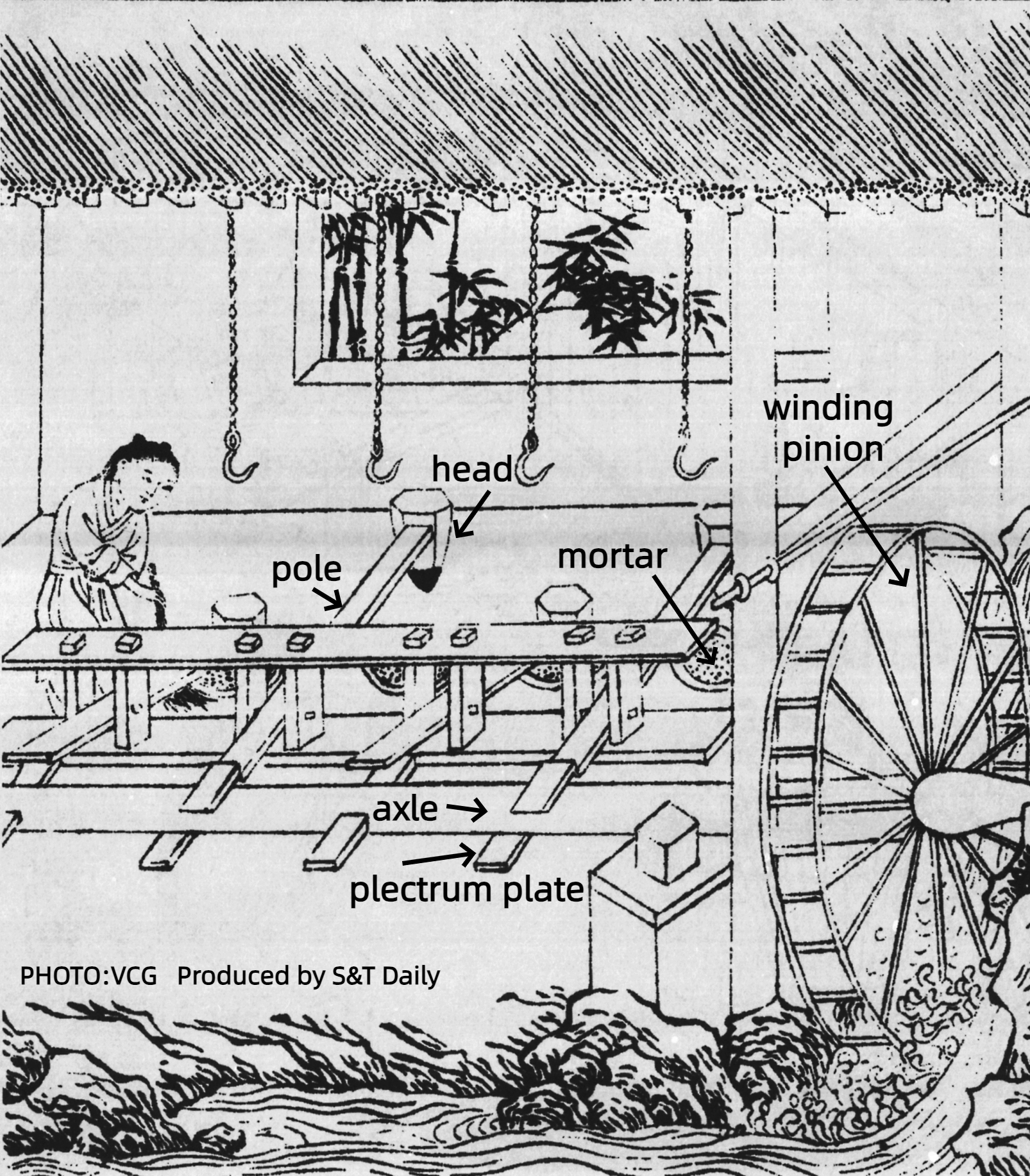 The water-powered trip hammer is a grain processing tool that uses the power of running water to grind grains, which was invented in the Western Han Dynasty(202 BC-8 AD).