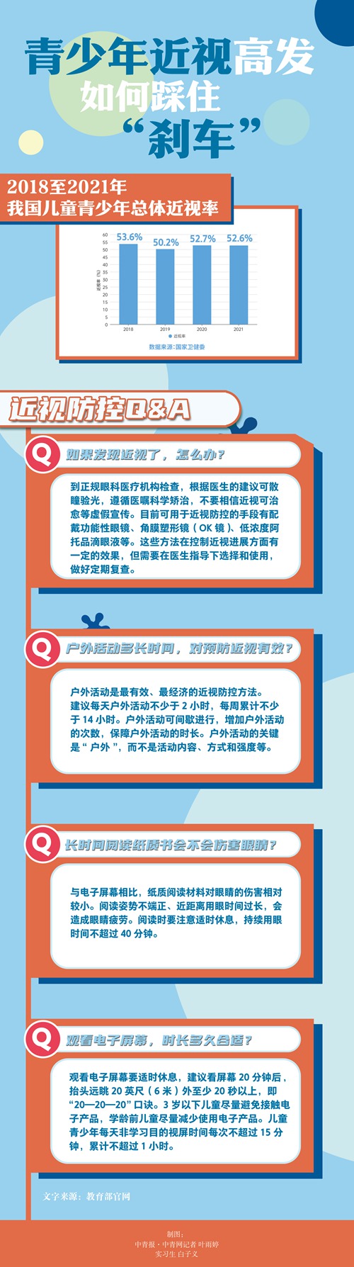 而在温州医科大学眼视光医学部主任、教育部近视综合防控专家宣讲团团长瞿佳看来,从总体上说,我国近视防控的确取得了标志性的进展。“最重要的就是我们的近视率下降了,从2018年的53.6%到2021年的52.6%,下降了一个百分点。”“其实,这几年的疫情极大干扰了近视防控工作的正常进行。”瞿佳告诉中青报·中青网记者,孩子们宅在家里上网课,活动少了,走到户外也少了,电子产品的使用却更多了,而家长对孩子近视管控的力度也不如学校。