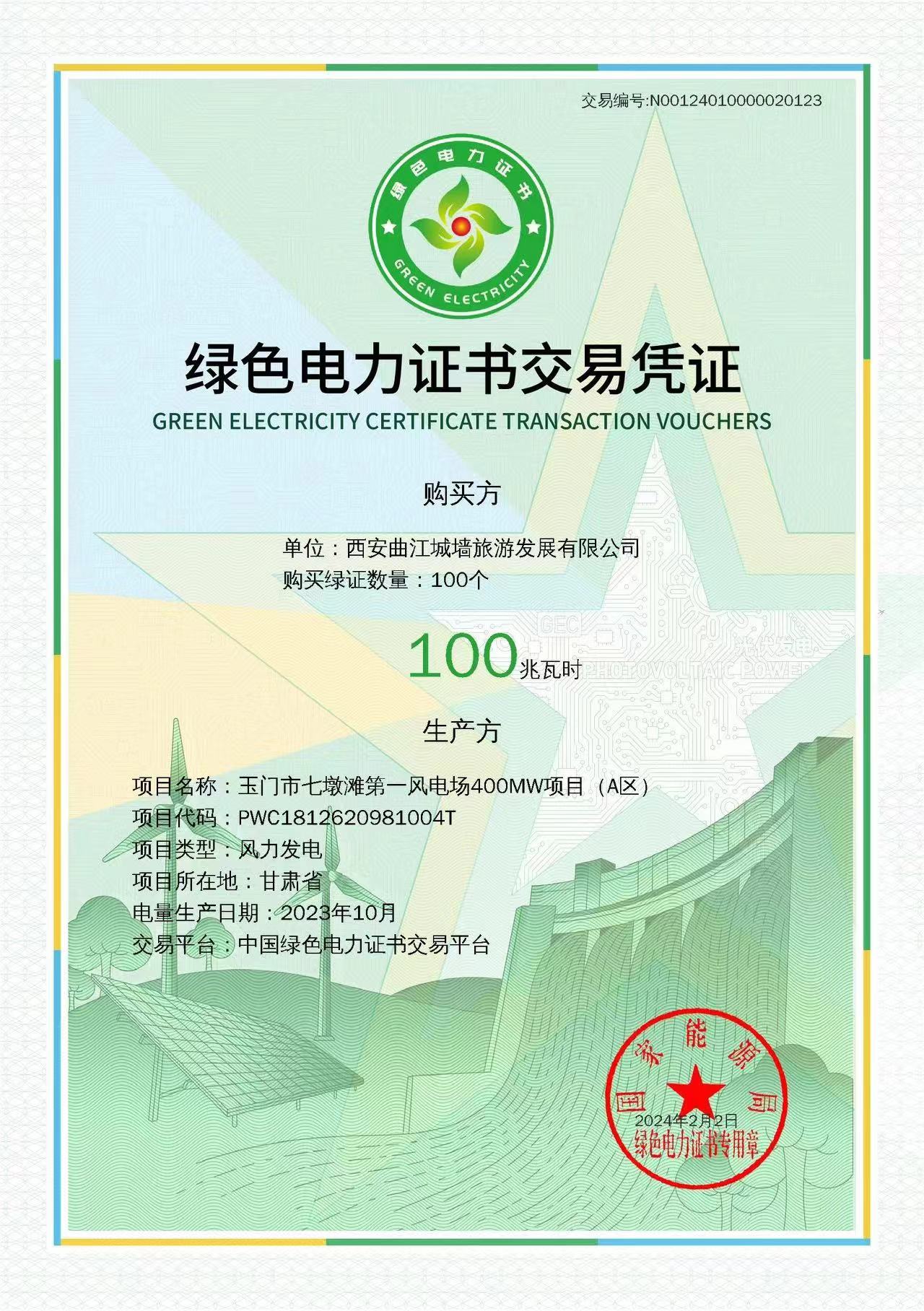 绿色电力证书交易凭证 。西安城墙景区提供