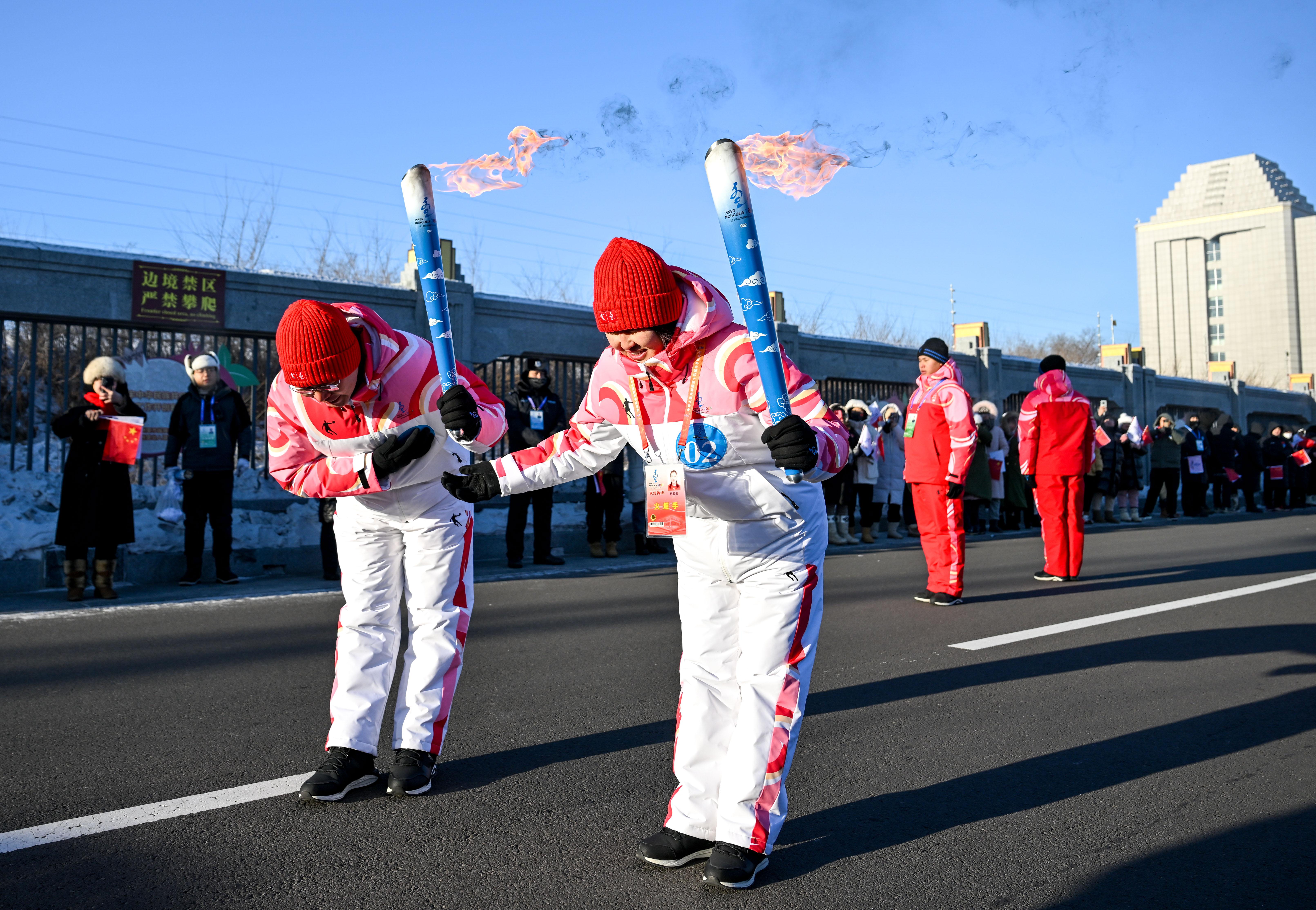 2月3日,在内蒙古呼伦贝尔市满洲里国门景区,火炬手包玲玲(右)和钱卓在火炬传递活动中。 新华社记者 连振 摄