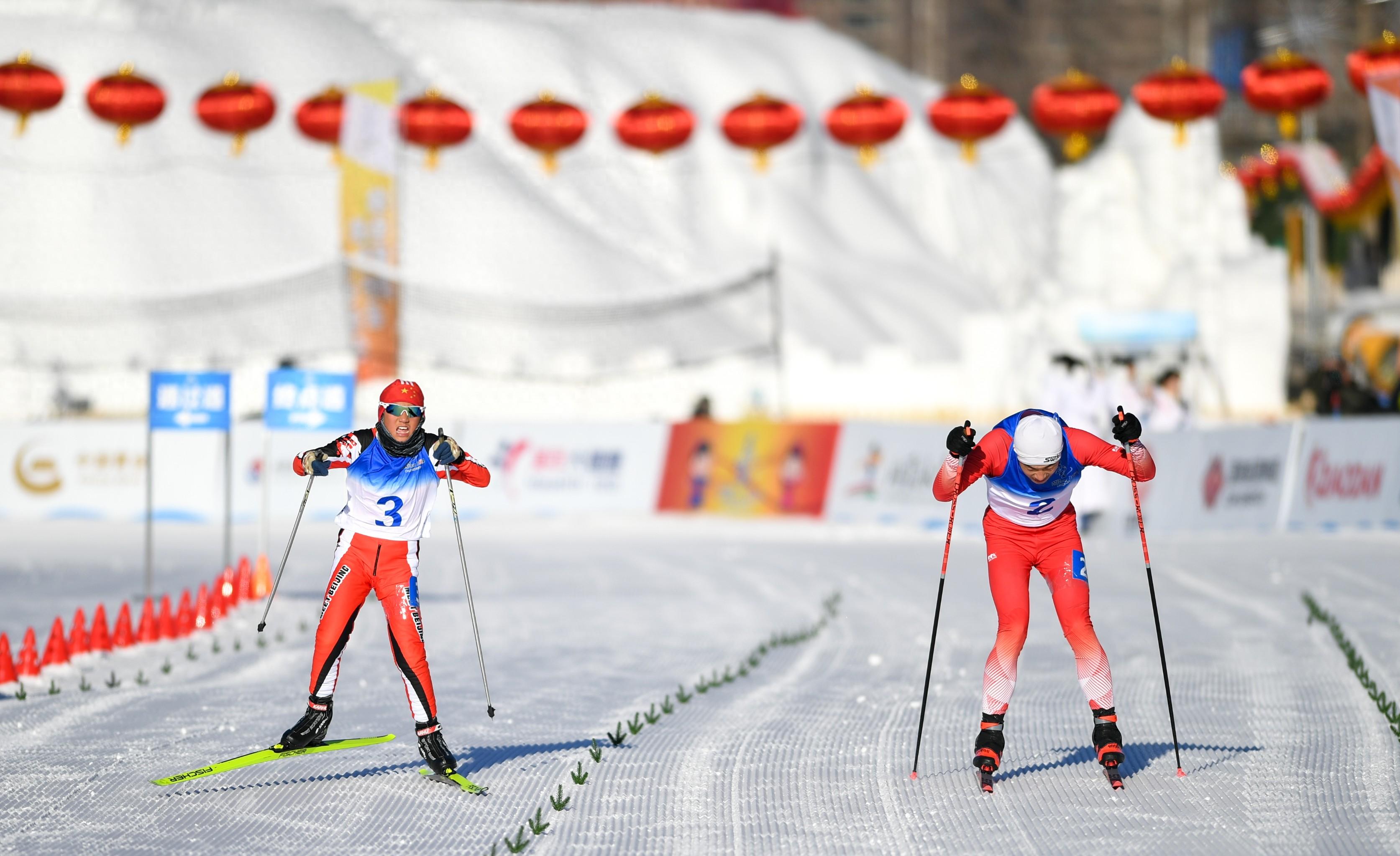 1月14日,河北队选手范析默(右)和黑龙江队选手郭铭旭在男子4X1.5公里团体接力(自由技术)决赛中冲刺。 新华社记者 贝赫 摄