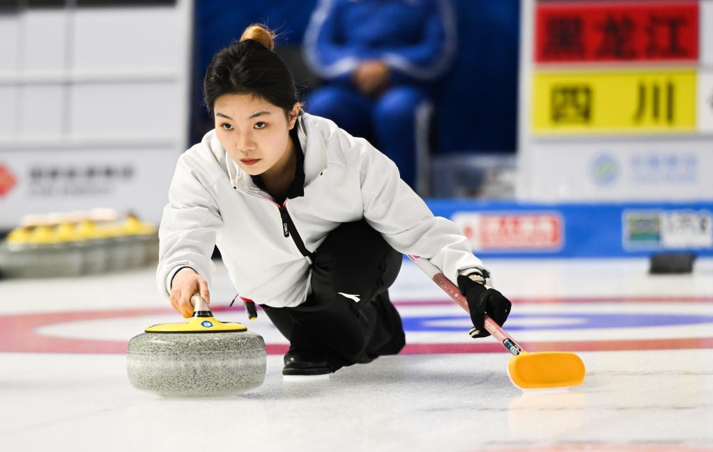 1月17日,四川队选手崔欣然在第十四届全国冬季运动会冰壶青年组比赛中掷壶。新华社记者 刘磊 摄