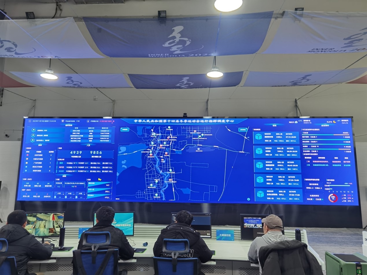 “这块大屏幕是‘十四冬’运行指挥调度中心数据监控区的重要组成部分。”“十四冬”运行指挥调度中心工作人员于漫莹介绍,大屏幕上汇总了值班、赛事、人员、场馆等信息,基于数据汇集处理等技术,“十四冬”运行指挥调度中心已建成集协同指挥、应急处置、安全监控、赛事管理、公共服务等于一体的信息化平台。