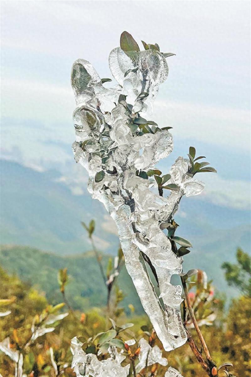 在梧桐山山顶,植物被透明冰块包裹。 深圳晚报记者 陆颖 通讯员 蔡如春 摄