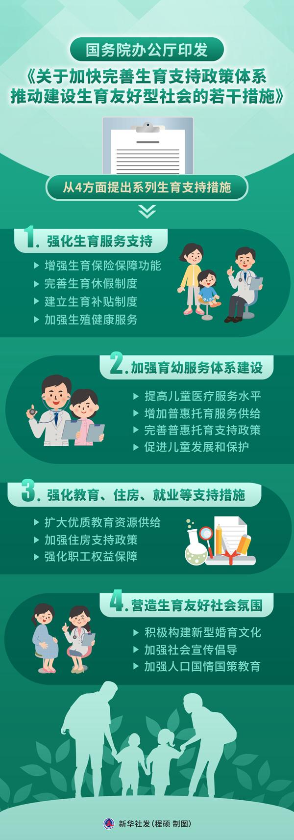 国务院办公厅印发的《关于加快完善生育支持政策体系推动建设生育友好型社会的若干措施》28日对外发布,从4个方面提出13条具体举措,降低生育、养育、教育成本,营造全社会尊重生育、支持生育的良好氛围。