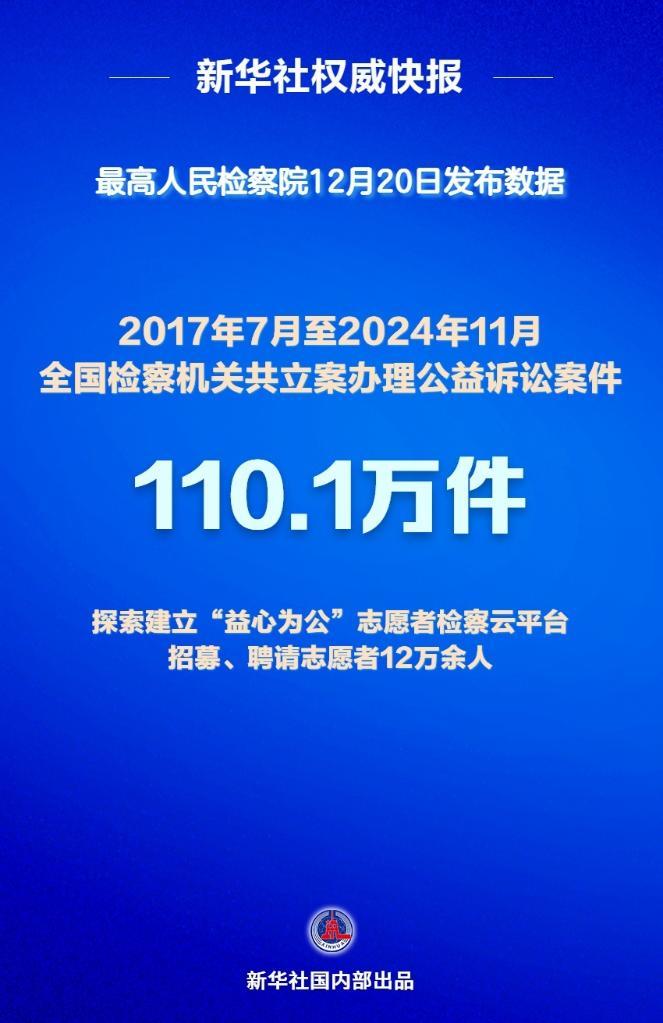 最高人民检察院12月20日发布检察公益诉讼有关情况显示,2017年7月至2024年11月,全国检察机关共立案办理公益诉讼案件110.1万件,其中行政公益诉讼案件98.9万件,民事公益诉讼案件11.2万件。