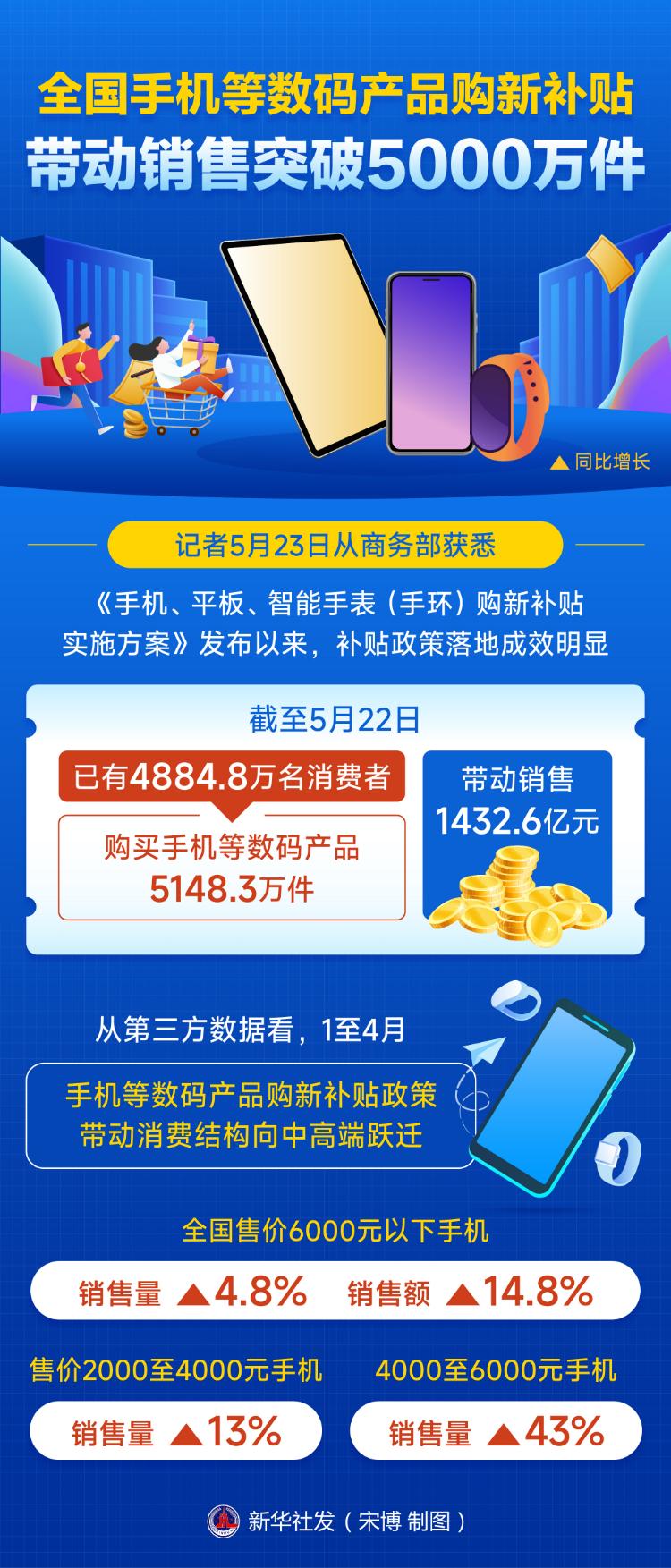 记者23日从商务部获悉,《手机、平板、智能手表(手环)购新补贴实施方案》发布以来,补贴政策落地成效明显,截至5月22日,已有4884.8万名消费者购买手机等数码产品5148.3万件,带动销售1432.6亿元。