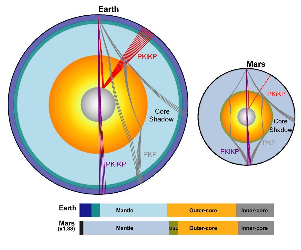 在进一步分析中,研究团队首次在火震数据中识别出被视为“固态内核标志”的PKiKP震相信号。这一发现为火星存在固态内核提供了证据。结合不同火核震相,团队测得火星固态内核半径约600公里,占火星半径的五分之一。如将火星按比例放大至地球大小,其内外核结构比例与地球高度接近。