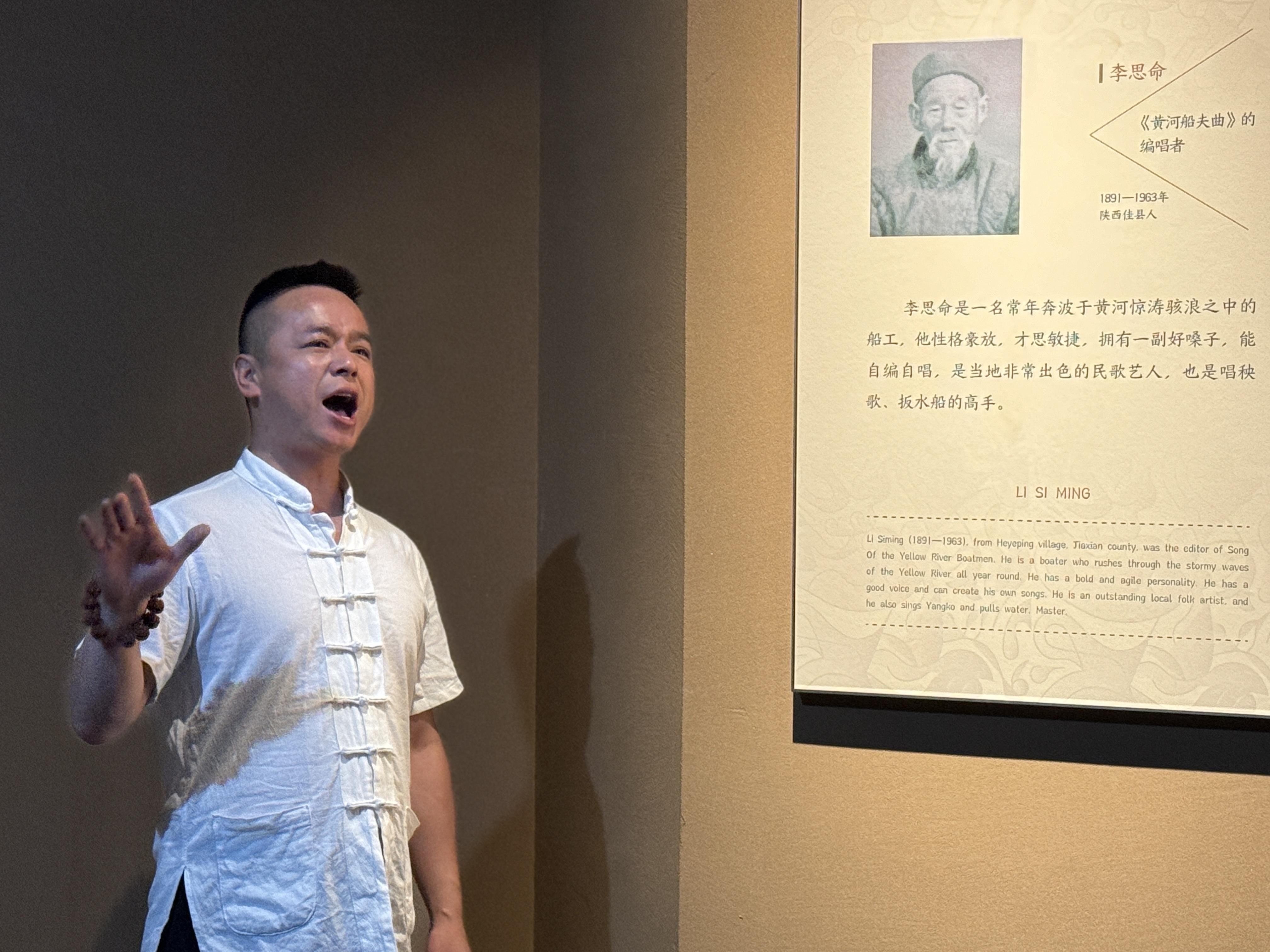 “你晓得天下黄河几十几道弯……”陕北民歌博物馆演唱老师王志行一开嗓,游客立刻被“钉”在原地。他没有拿扩音器,也没有介绍展品,而是站在一幅黄河奔腾的全息投影前,用一曲《黄河船夫曲》把所有人“拽”进了黄河岸边的纤夫劳作现场。