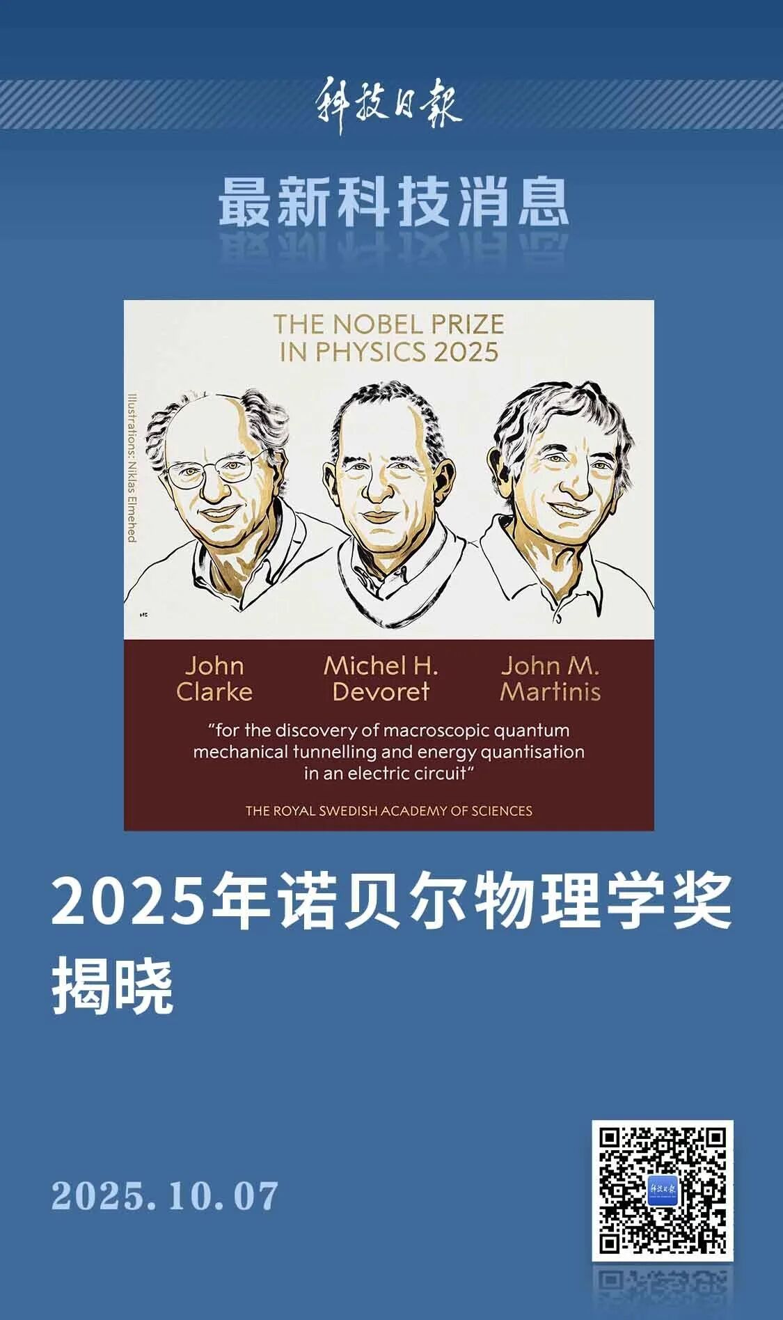 刚刚,瑞典皇家科学院宣布,将2025年诺贝尔物理学奖授予John Clarke, Michel H. Devoret, John M. Martinis,以表彰他们在电路中发现宏观量子力学隧穿和能量量化。