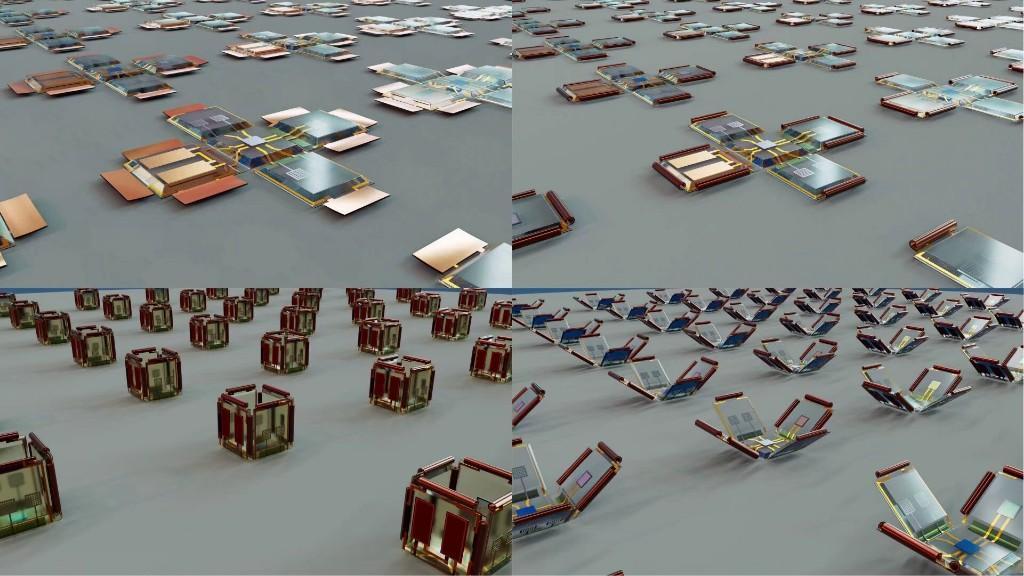 这些机器人受折纸启发,采用柔性制造工艺,以智能折叠电路材料为基础,使平面电子系统能自主卷曲并折叠成中空的微型立方体,具备内外双重功能。这种结构不仅扩展了表面空间,可容纳太阳能收集器、计算单元和光信号系统,还支持内外表面的交互与运动。