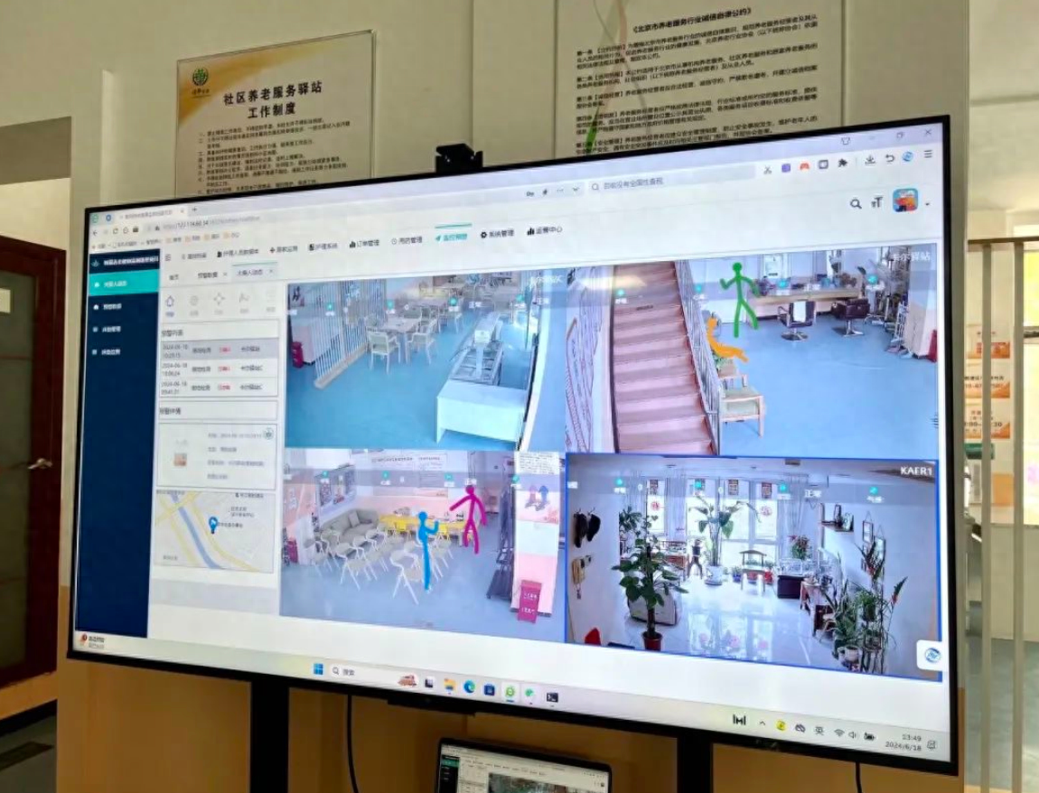 “发现倒地监测预警!”6月27日,在北京经开区荣华街道卡尔社区养老服务驿站,几位工作人员正在屏幕前测试,随着一位工作人员假装摔倒,屏幕上显示的“火柴人”也呈现倒地状态,并发出监测预警提示声。