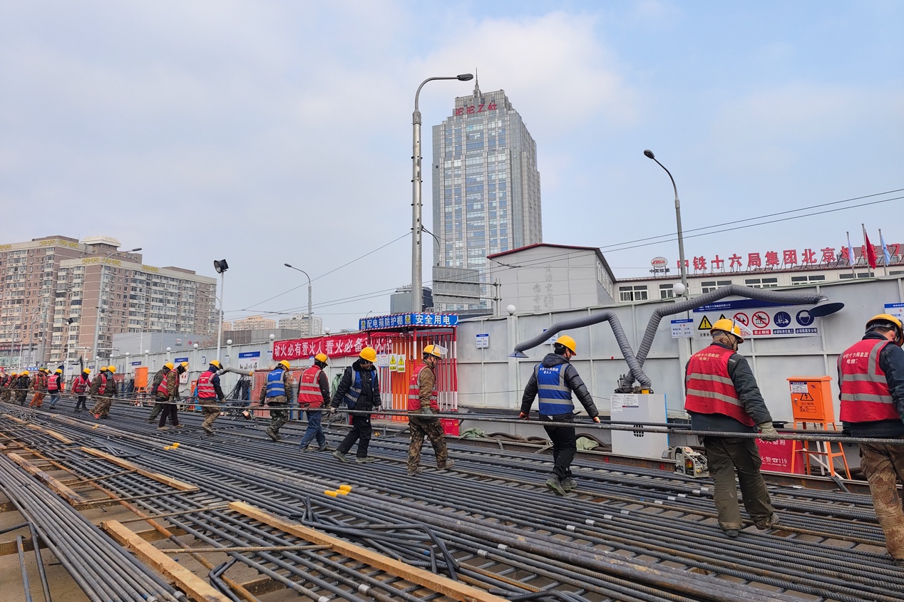 北京市朝外大街一侧,中铁十六局北京轨道交通28号线东大桥站施工现场,勤劳的建设者用奋斗拉开了新春序幕。